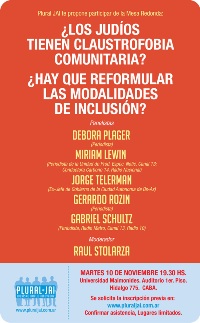 A modo de disparador, Raúl contó que desde hace tiempo Plural JAI trabaja tratando de movilizar a la comunidad judía para salir de su letargo. Letargo que es reflejo de una sociedad que no se compromete. Para esto, oportunamente se había realizado una actividad con Pepe Eliaschev sobre la apatía comunitaria. Sólo el 10% de la población judía estimada en el país es socia de AMIA, solo entre 30 y 40% de los judíos argentinos concurre a alguna institución (templo, escuela, club, etc.). Debemos preocuparnos y ocuparnos de mejorar esta situación y por eso la convocatoria de la fecha.