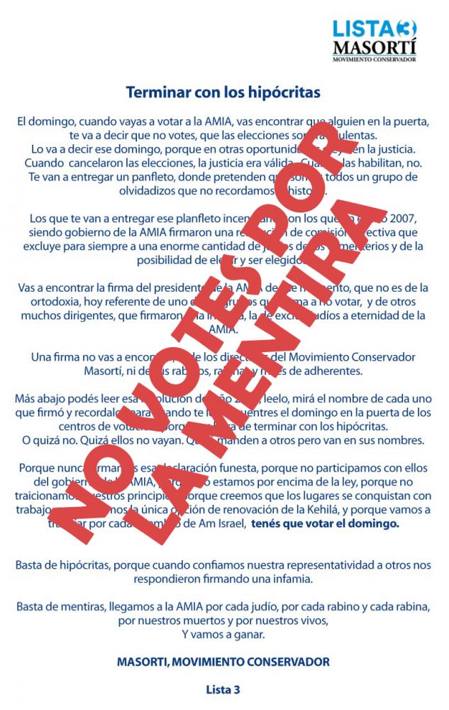 En un reciente comunicado aseguran que nuestros movimientos van a llevar gente a las puertas de los centros de votación de las próximas elecciones de AMIA para pedirle a la gente que no vote, ESO ES UNA MENTIRA!!!!
