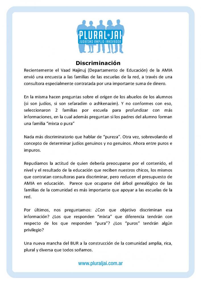 Comunicado de Pural JAI - DISCRIMINACION
