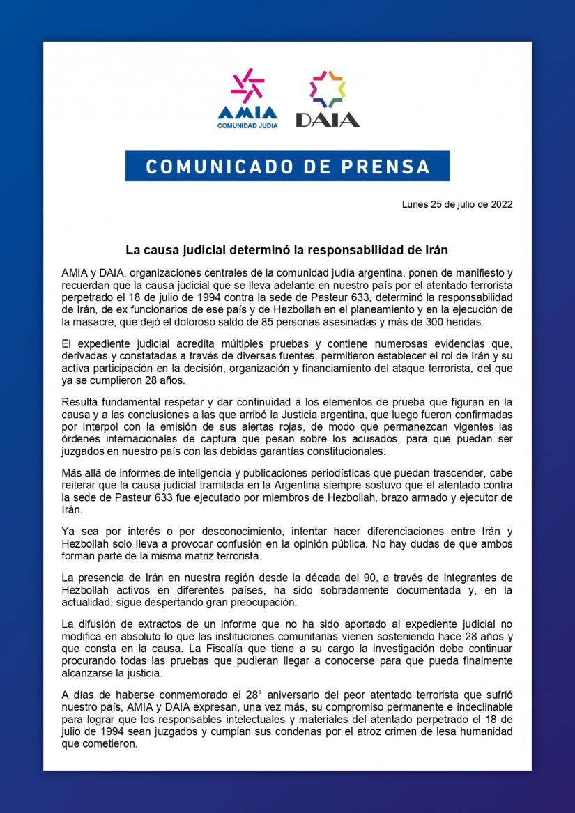 AMIA y DAIA, organizaciones centrales de la comunidad judía argentina, ponen de manifiesto y